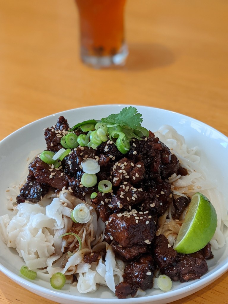 To plate we placed the noodles at the bottom and then poured the air-fried beef into the sauce stirring together makin sure all the beef was coated before placing on the noodles.
