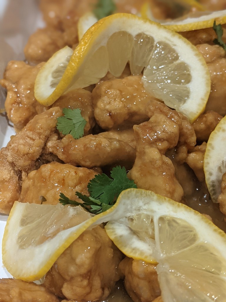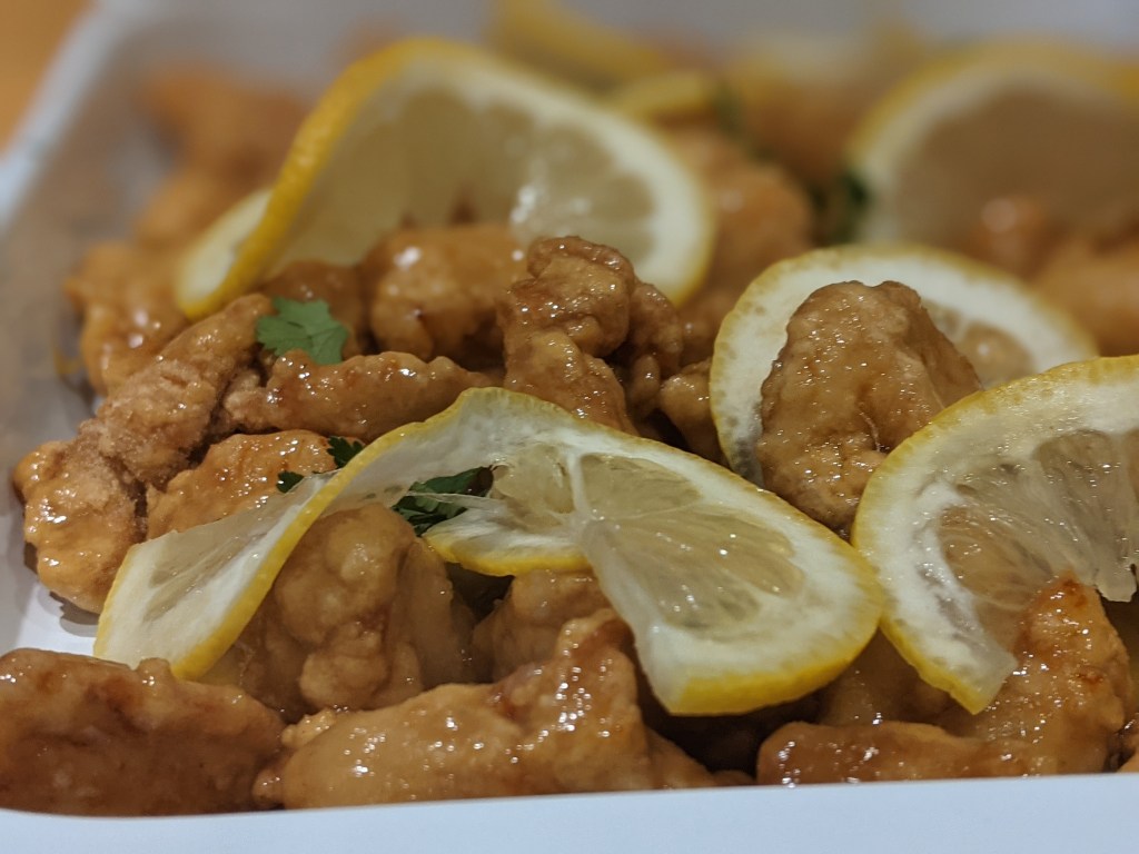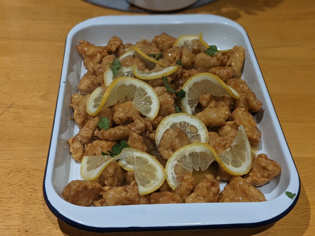 When you are on your last batch of chicken piece, add the lemon juice, ginger, garlic and zest to the sauce. Simmer for 30 seconds and then add the cornflour slurry to thicken. Simmer sauce for 2 minutes and then pour over the cooked chicken.