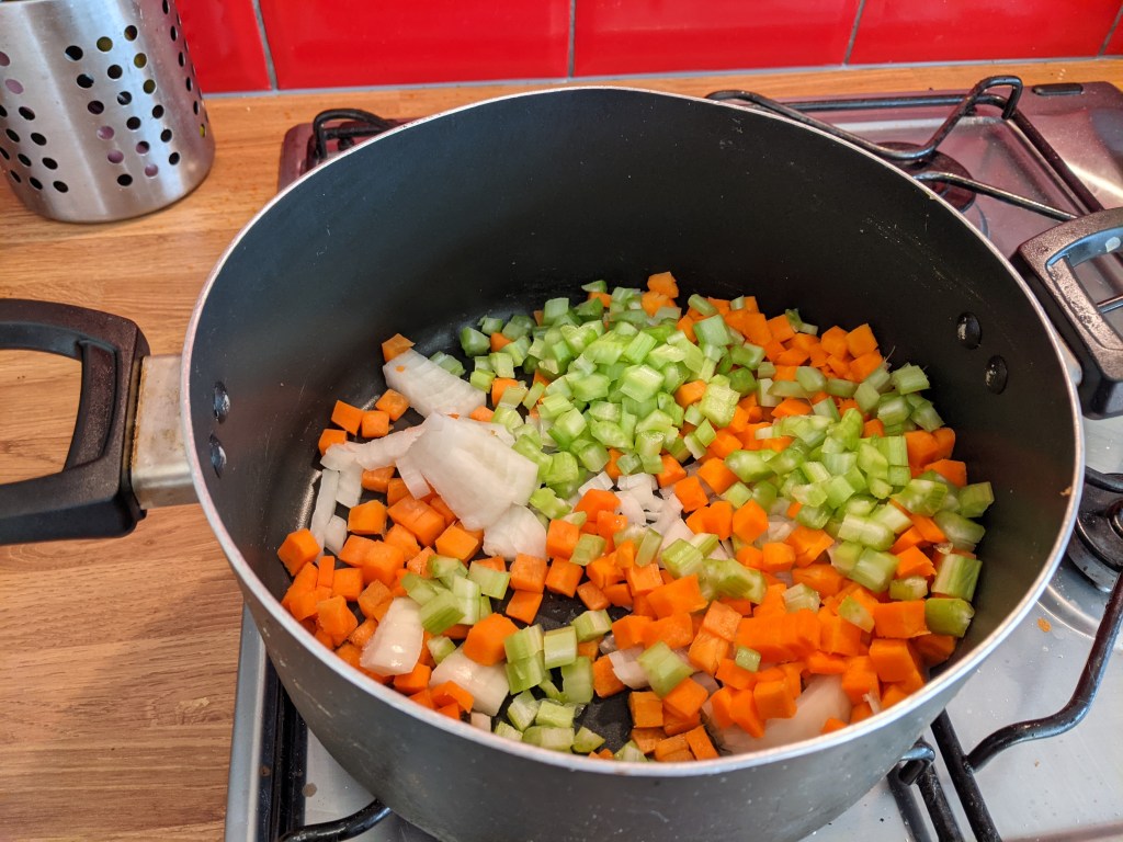 Heat up olive oil in a large saucepan all of the diced vegetables and cook on a low heat for 10 minutes with the lid on the saucepan.