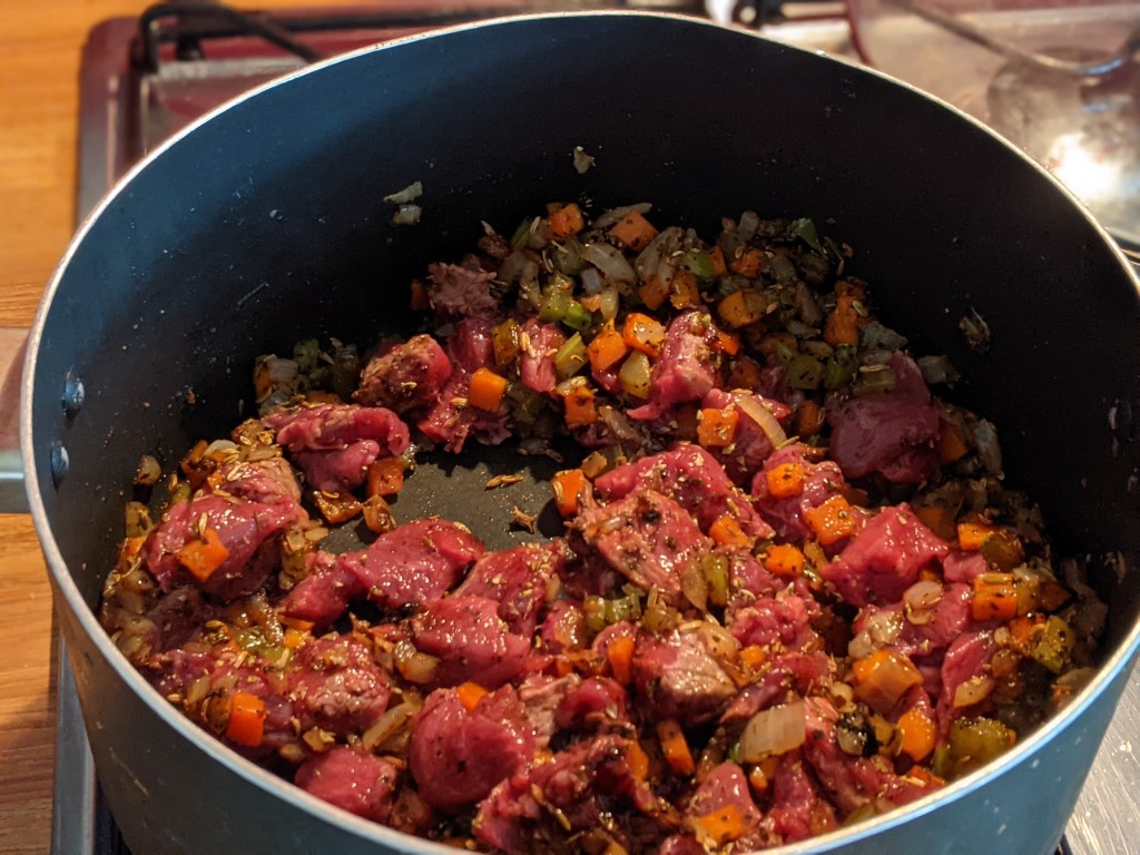 Once the vegetables are softened add the beef, herbs, garlic, tomato puree, sugar and cook for a further 5 minutes searing the beef. Once this is mixed in add the red wine and simmer for a minute.