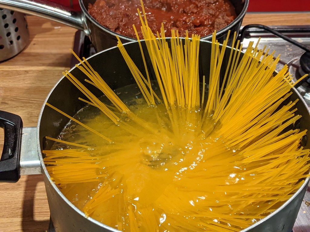 Whilst the ragu is cooking enjoy yourself with a nice glass of wine or cup of tea and then with 10 minutes to go cook the spaghetti in a large saucepan of salted boiling water.