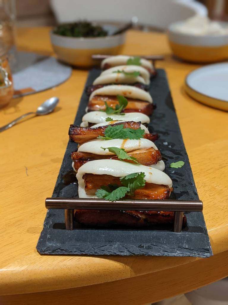 When the dough has doubled in size it is ready to start shaping into the buns. Split the mixture into 20 equal size pieces. Roll one piece at a time into a small ball place on a piece of greaseproof paper flatten the dough, place a piece of grease proof paper over half of the dough and fold over to create the classic Bao bun shape. Leave the buns to rest for 20min. Place 4-5 buns in a steamer and steam for 8 minutes. The buns are ready.