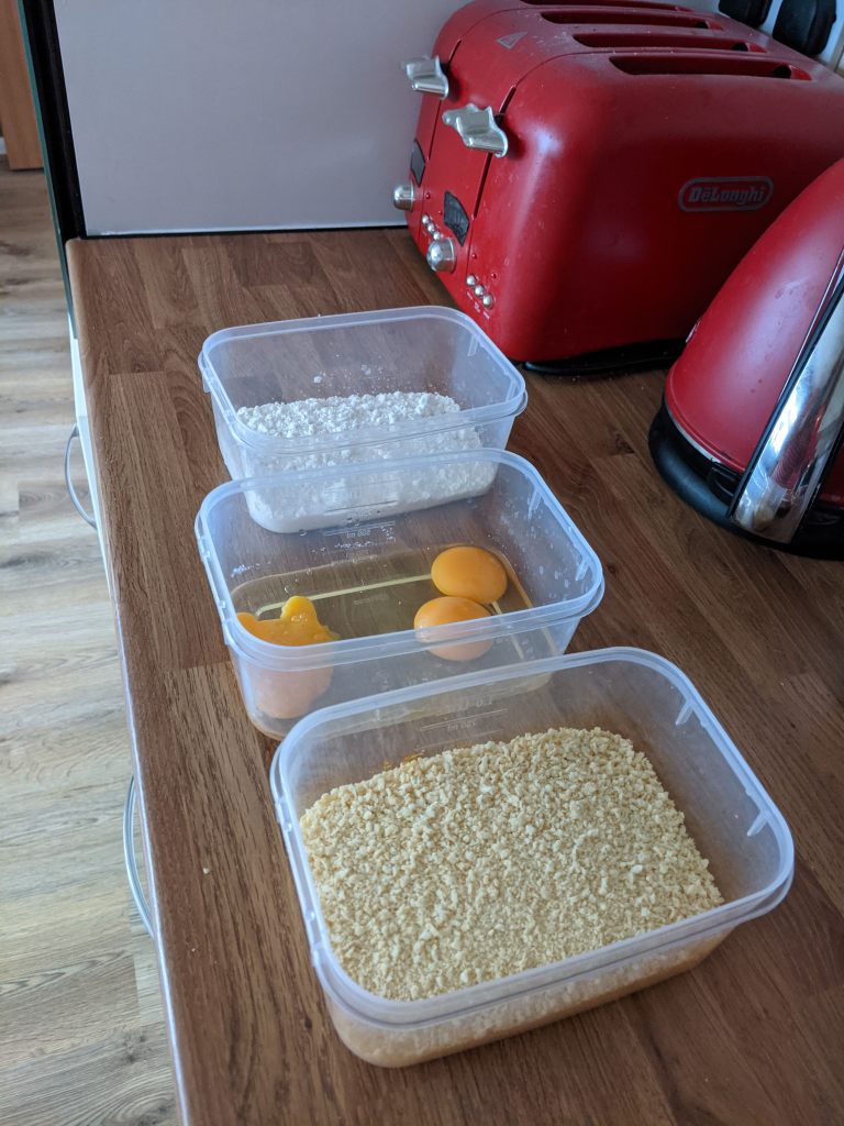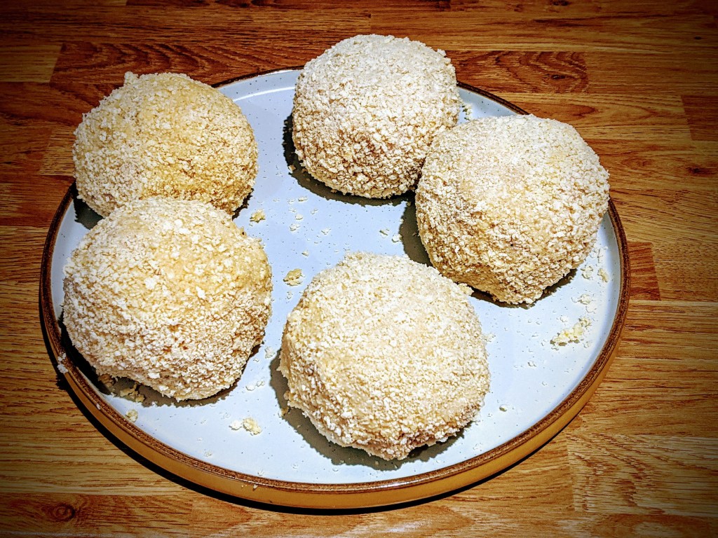 Once moulded dip in flour, egg and then bread crumbs until coated all over and repeat the process for each scotch egg. ( We put them in the fridge for an hour to chill.)