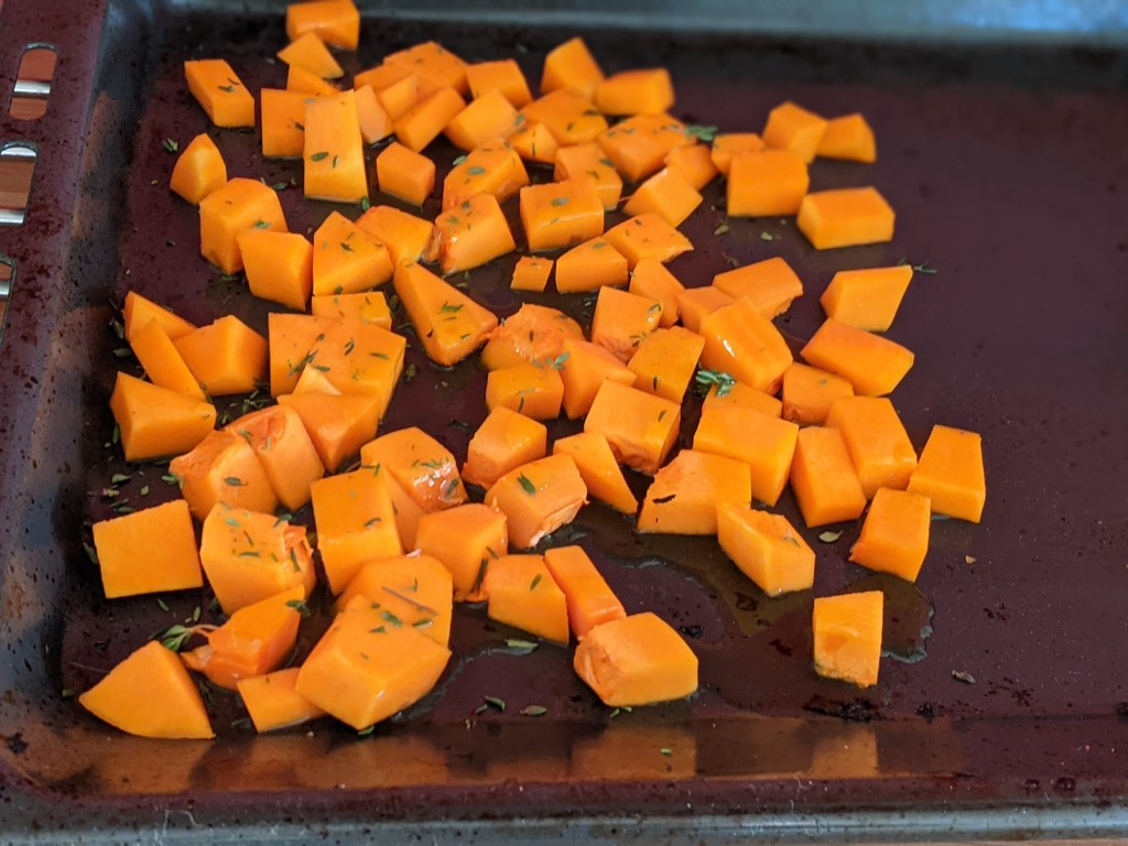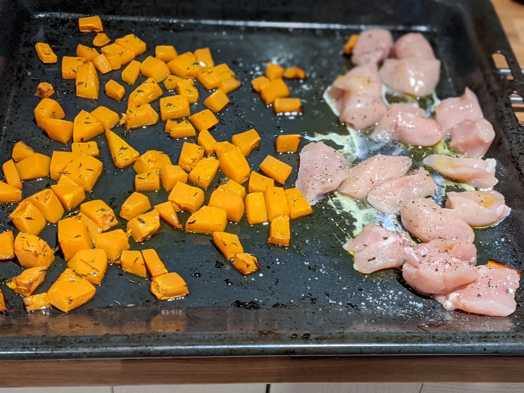 To begin with peel the butternut squash and cut into cubes and place on a baking tray with olive oil and thyme, put this in the oven for 10 minutes at 180c before adding the chicken on the same tray and cook for a further 30 minutes.