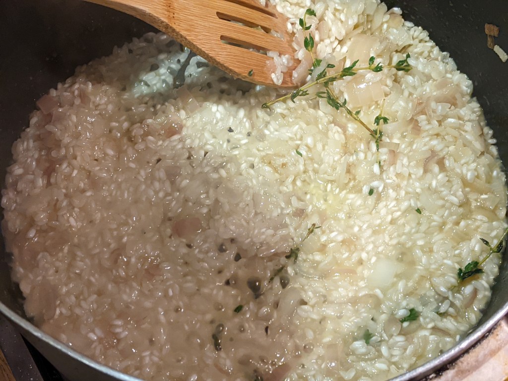 Once the shallots are soft and translucent add a few sprigs of Thyme and add the rice, stirring so that all grains are coated with the butter and oil. Add the gin or white wine at this stage and wait until the liquid is absorbed.