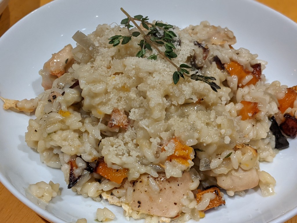 Once you have done this take the butternut squash and chicken out of the oven and add to the risotto. At the same time add the parmesan and mix well.