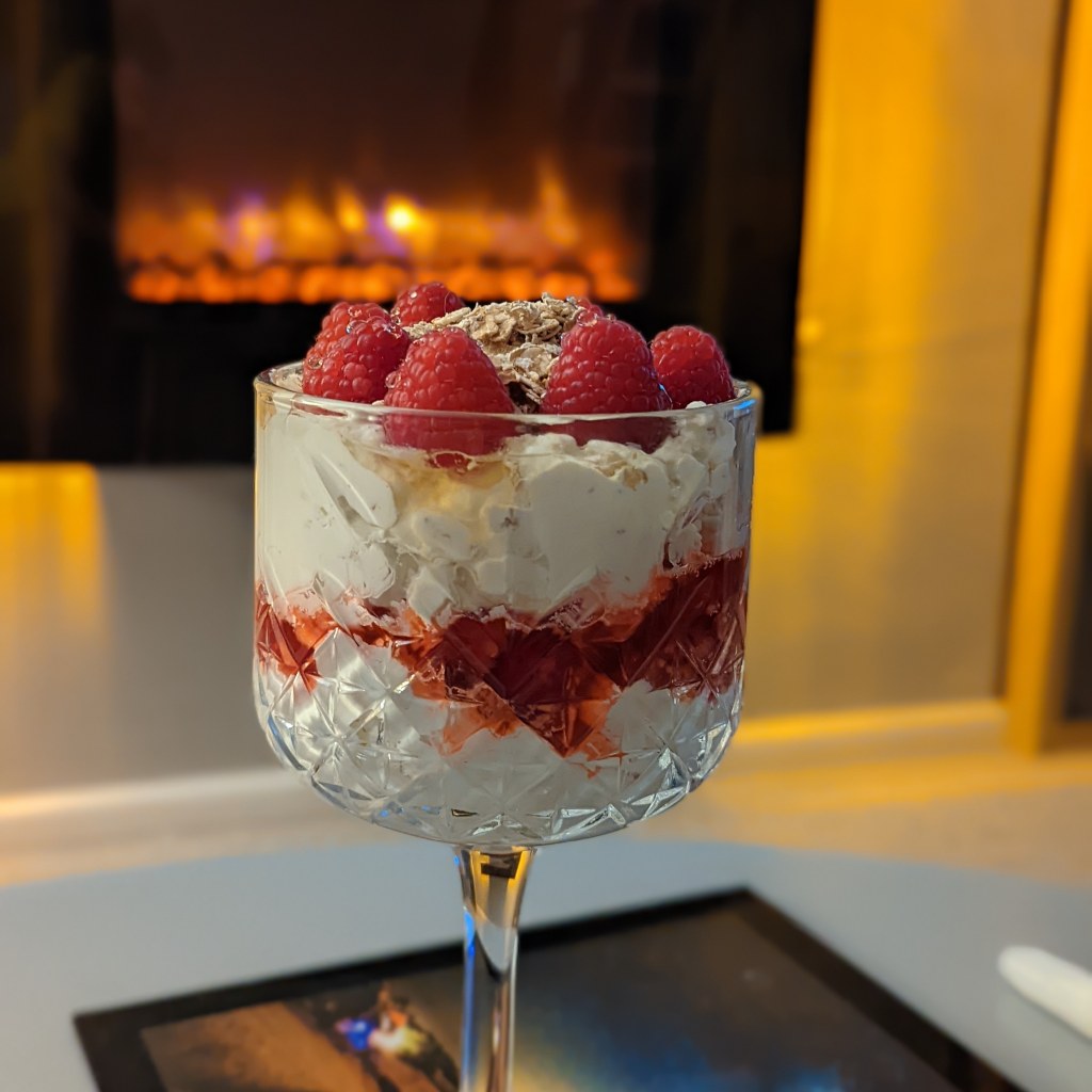 Take the glass/bowl you have decided to use and start with a small layer of the cream mixture, then add a layer of crush raspberries then another layer of cream. Now decorate with the whole raspberries and toasted Gf oats and a small drizzle of honey.