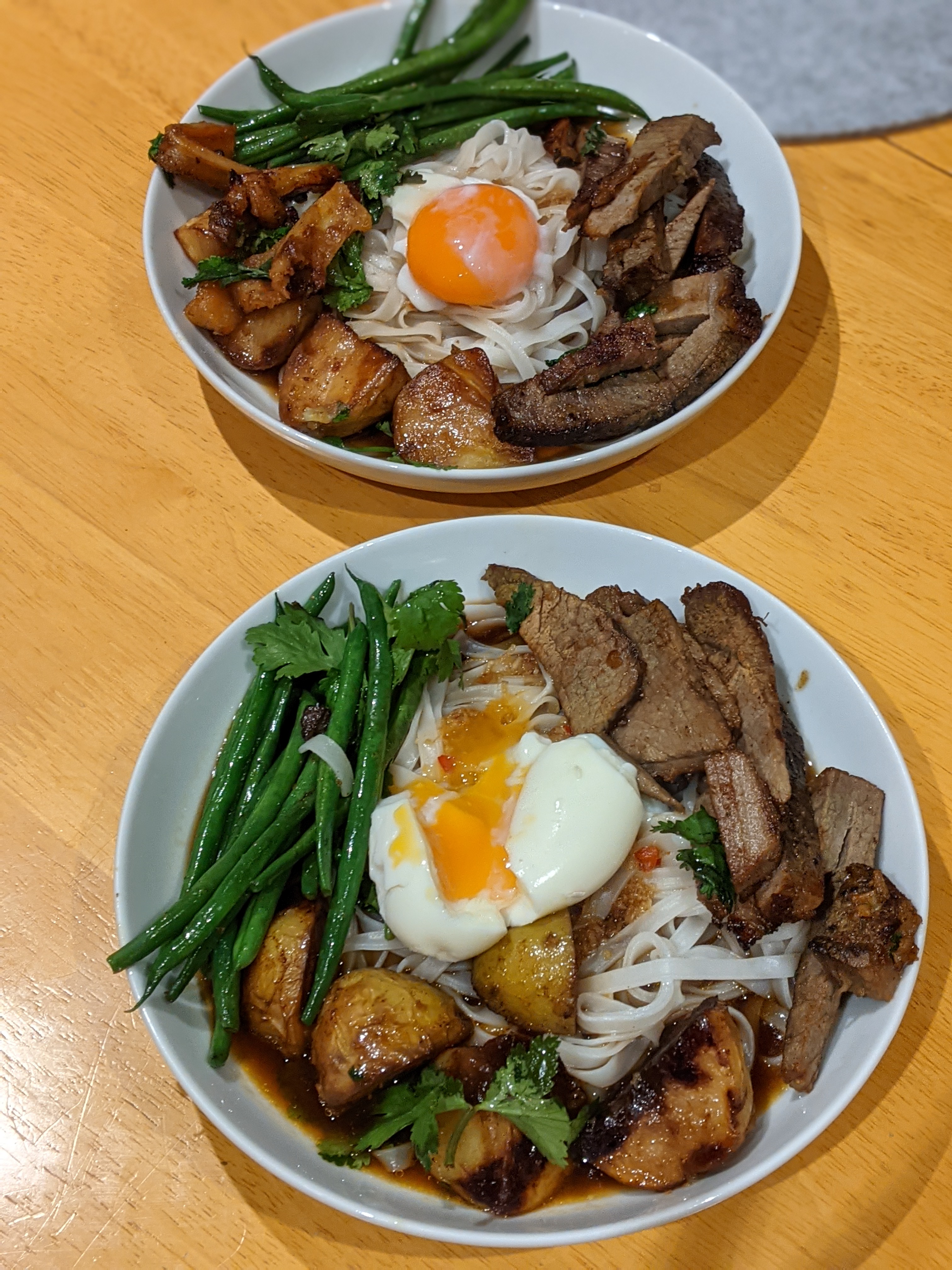 Once the noodles are done rinse off and put at the bottom of your plate. Once you have done pour in the broth, and then stack your meet and leftover vegetables on top. After this put the eggs on top and scatter coriander on top.