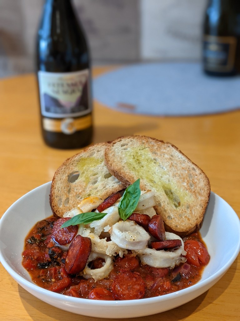 A great recipe for a flavoursome and rustic meal. The chorizo adds to the contrast of the squid.