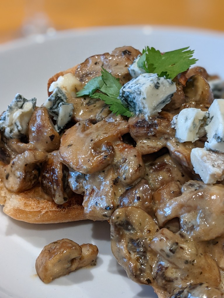 Once the bread is toasted spread butter to this and then serve the mushrooms on top. We add extra blue cheese, as we love it.