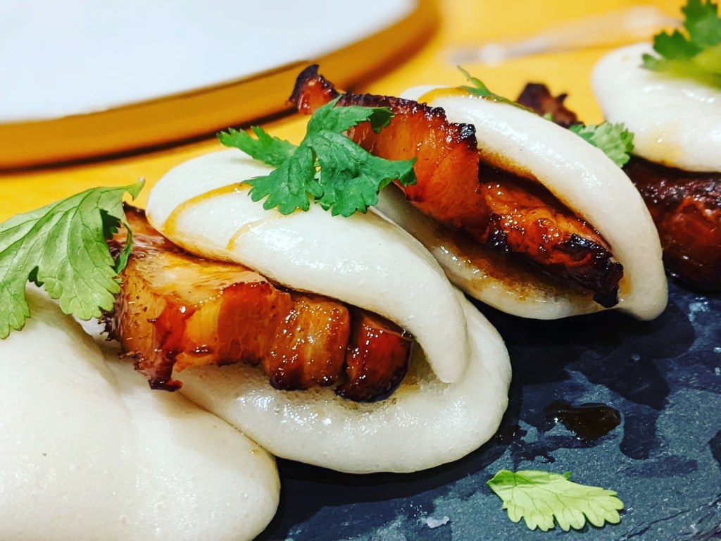 When the dough has doubled in size it is ready to start shaping into the buns. Split the mixture into 20 equal size pieces. Roll one piece at a time into a small ball place on a piece of greaseproof paper flatten the dough, place a piece of grease proof paper over half of the dough and fold over to create the classic Bao bun shape. Leave the buns to rest for 20min. Place 4-5 buns in a steamer and steam for 8 minutes. The buns are ready.