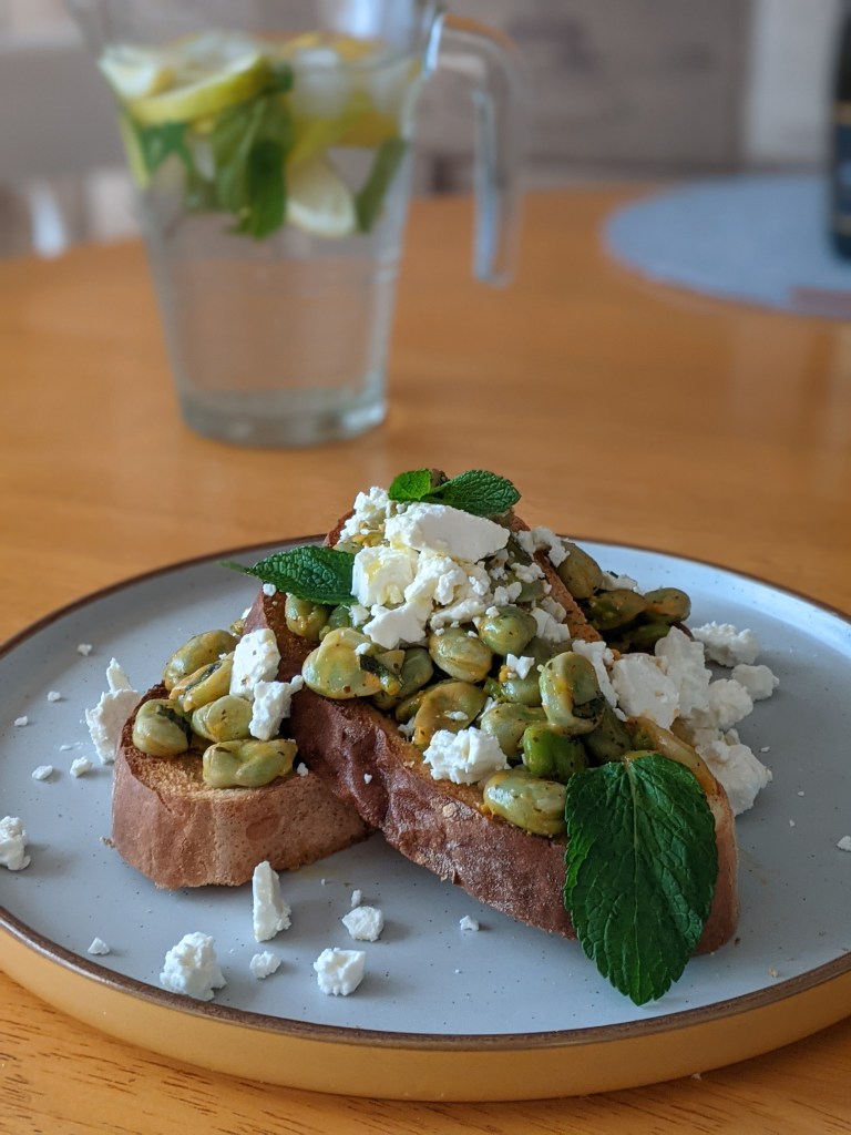 Once the broad bean mixture was ready we piled onto the toast and crumbled feta over the top and dressed with the remaining olive oil and mint leaves.