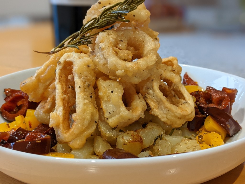 After 20 minutes the potatoes should be nice and crispy. Once cooked season with salt and then plate with the calamari and a side of your choice ( we had roasted pepper)