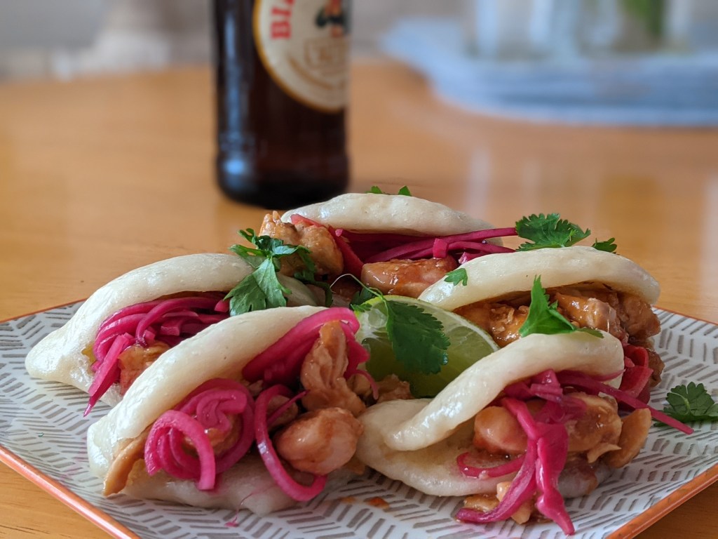 When the dough has doubled in size it is ready to start shaping into the buns. Split the mixture into 20 equal size pieces. Roll one piece at a time into a small ball place on a piece of greaseproof paper flatten the dough, place a piece of grease proof paper over half of the dough and fold over to create the classic Bao bun shape. Leave the buns to rest for 20min. Place 4-5 buns in a steamer and steam for 8 minutes. The buns are ready.