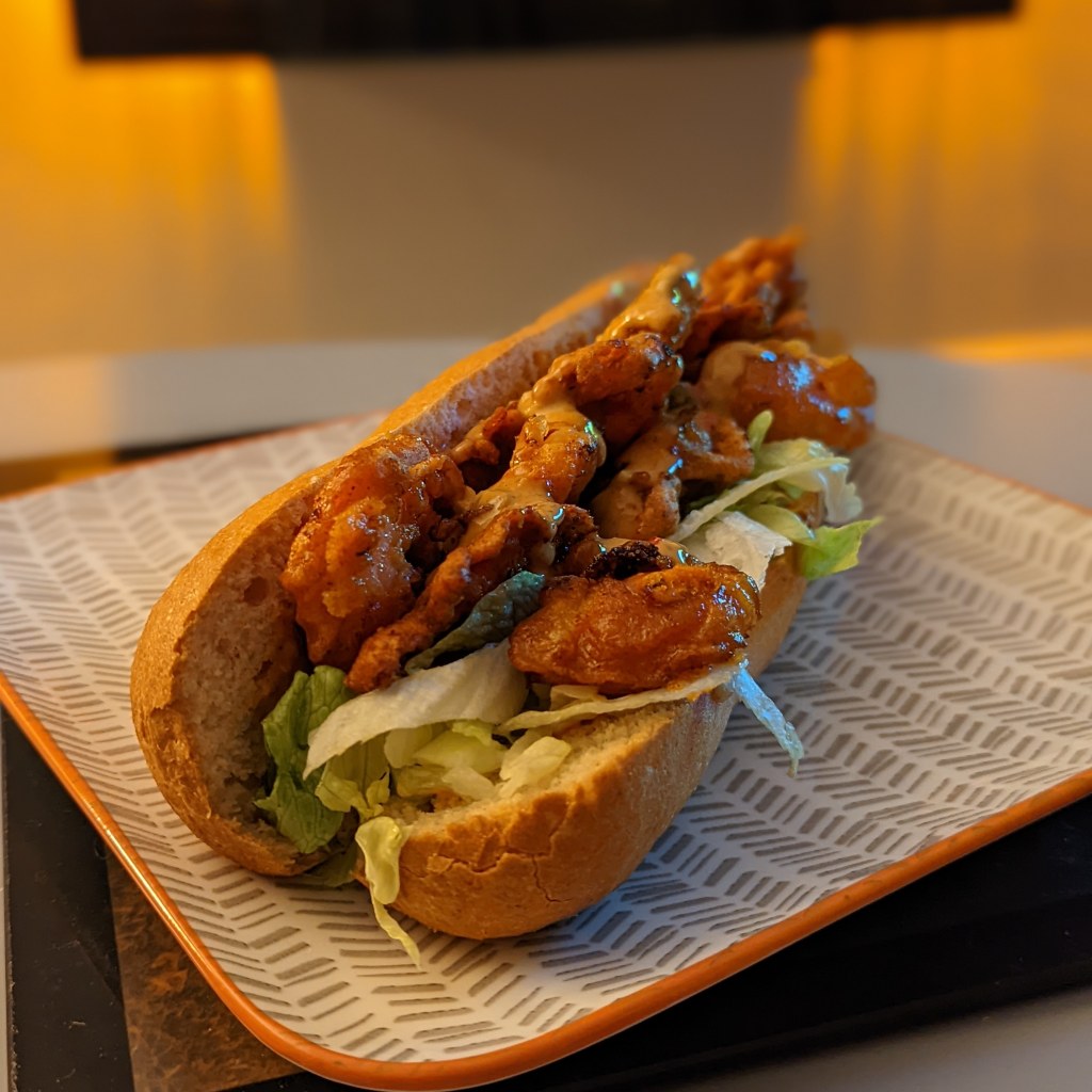 Once the prawns are cooked, prepare the Po’ Boy by slicing the baguette sideways and place half of the sauce on the bottom. Then place the lettuce and prawns in before drizzle more sauce on top.