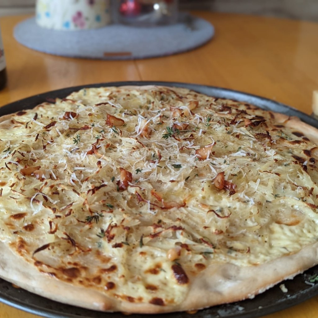 After 5 minutes take your pizza bases out of the oven and split your pizza sauce between the 2 bases and spread. Then sprinkle a generous amount of the grated potato over your pizza and at this point add your roasted smoke garlic if you wish. Cook in the oven for a further 15 minutes. Once your pizza’s are cooked drizzle with olive oil and a scattering of grated parmesan and enjoy.
