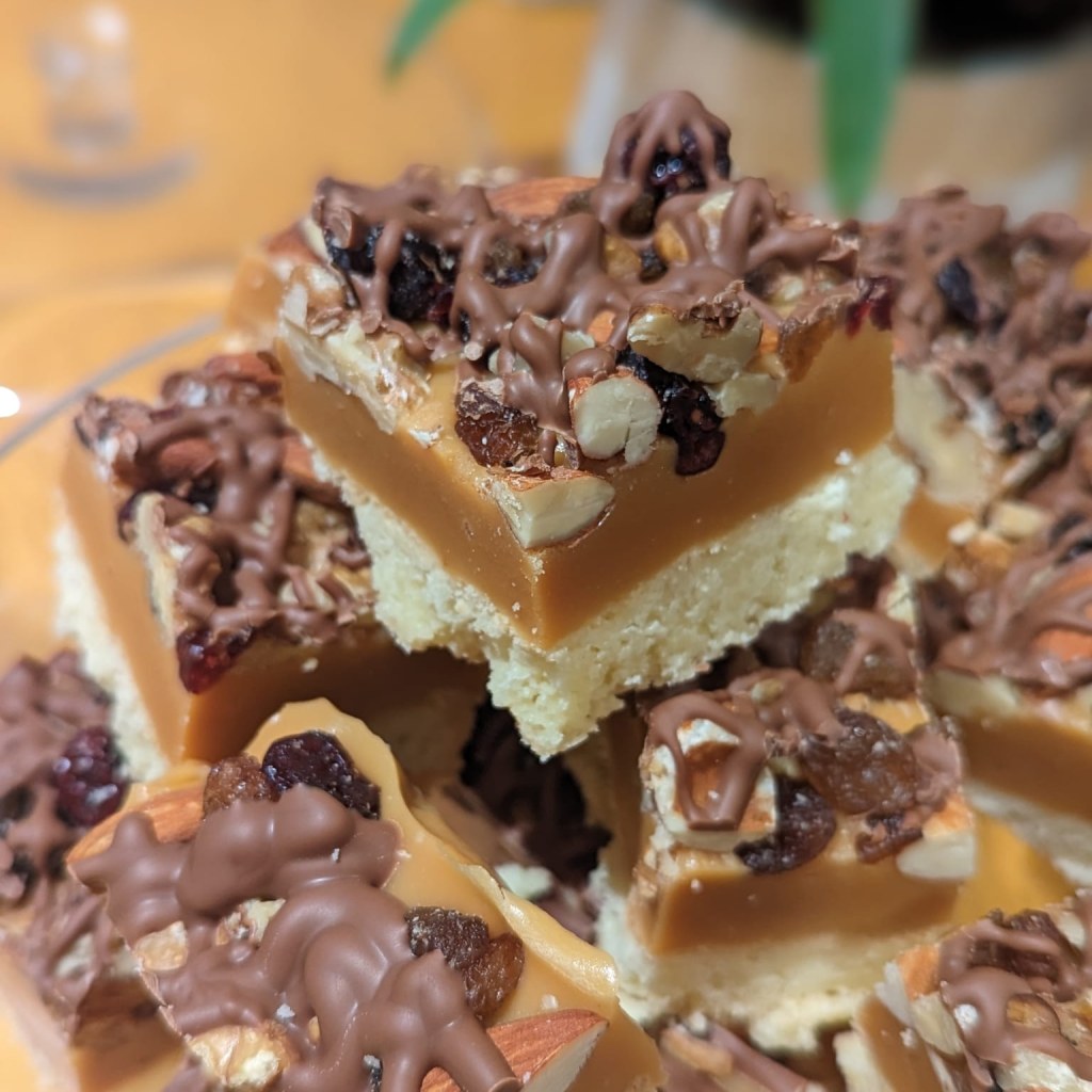 Whilst you are waiting for the shortbread to cool you can prepare your caramel. Add all of the ingredients for the caramel into a microwave staff bowl. Place the bowl into the microwave and cook for 1 minute burst for around 12-15 minute after each 1-minute take out of the microwave and stir. Once ready stir in the salt and pour onto the shortbread, then scatter on the fruit and nut mix and leave to set a little.