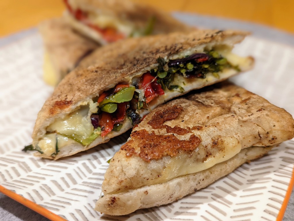 Whilst the vegetable is cooking you can prepare your sandwich by spreading pesto on each slice before putting a generous amount of cheese on top of the pesto on four slices of the bread