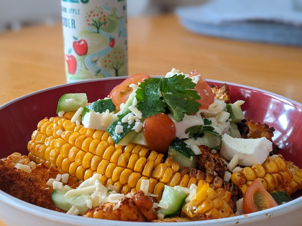 Whilst waiting for the corn, dice the cucumber, mozzarella and tomatoes and mix together adding the coriander and lemon.