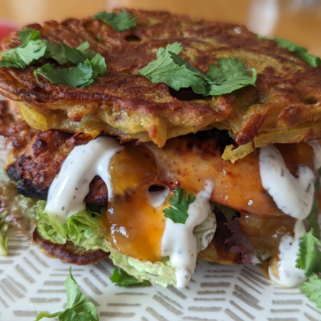 When all ingredients are cooked stack and add condiments of your choice, we added mango chutney, coriander and mint yoghurt sauce.