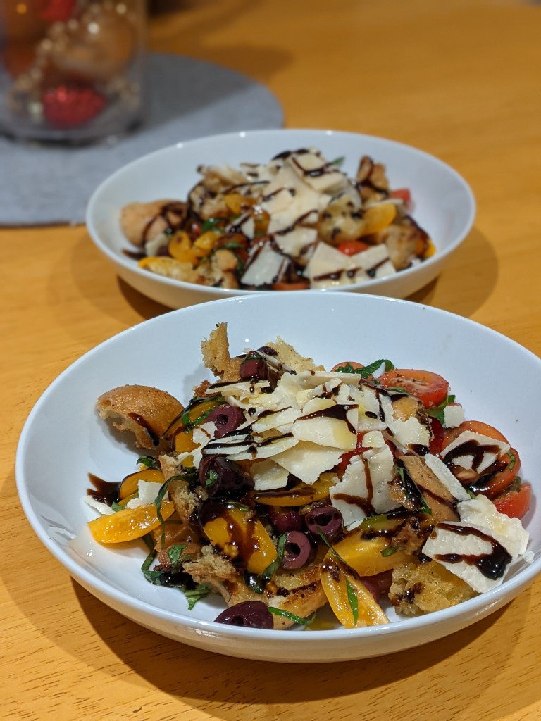 Now add the warm croutons to the rest of the ingredients in the bowl and mix well. Plate up, sprinkle with the parmesan shavings and drizzle with some balsamic vinegar glaze.