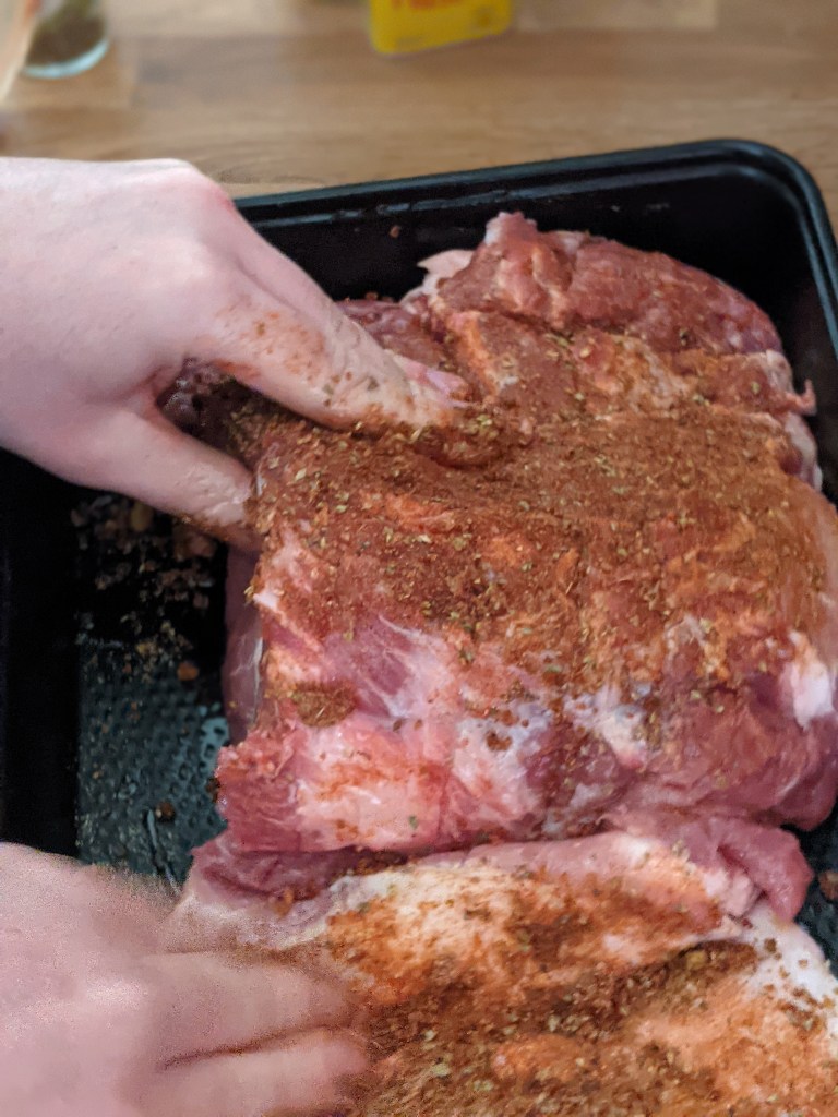 We then created the rub in a separate bowl, using all the dry ingredients. We then rubbed the pork with olive oil and then with the dry mix we massaged in the dry mix