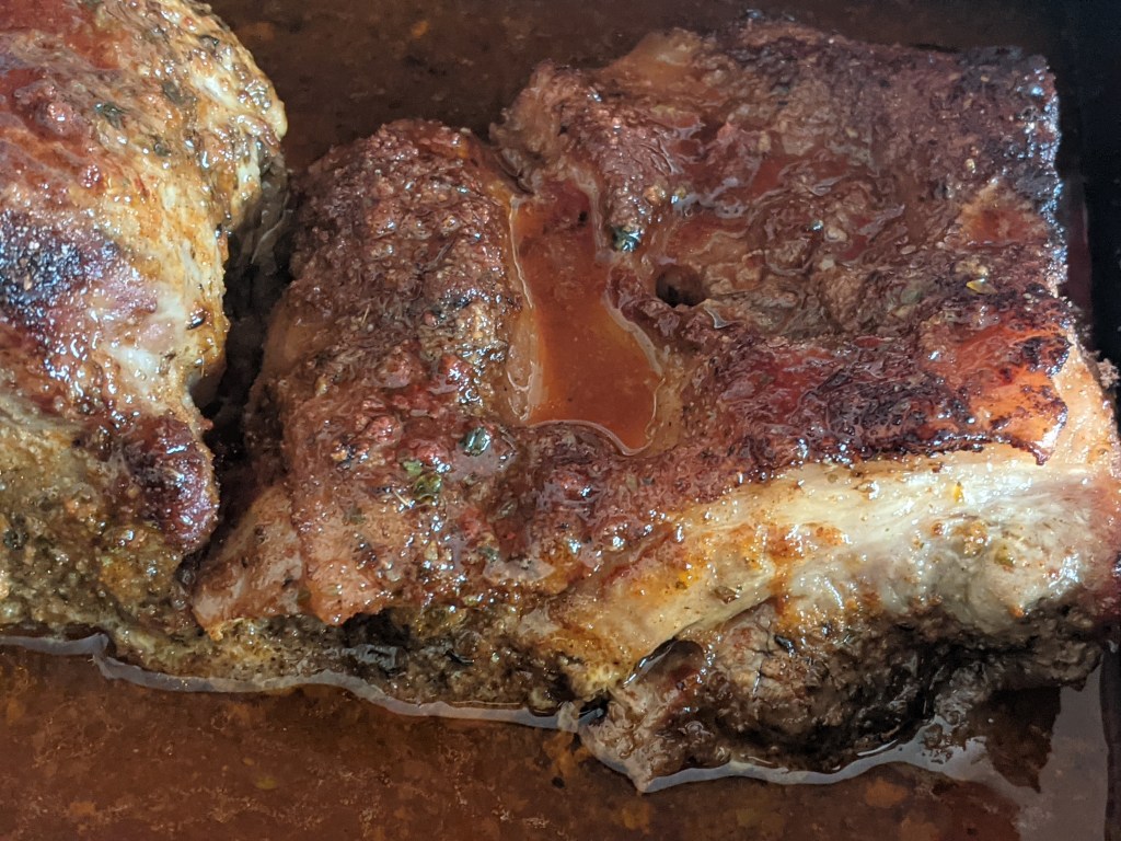 After 3 hours we checked the pork and basted it with the rest of the sauce adding the rest of the cider with 2 tbsp of barbeque seasoning.