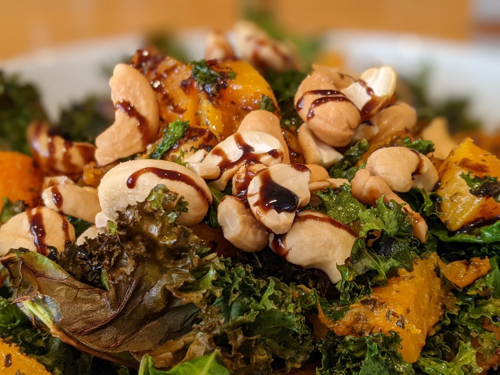 Once the kale and butternut squash is cooked take on and dish up. Once dished up, scatter with cashew nuts and add a generous amount of the balsamic glaze.