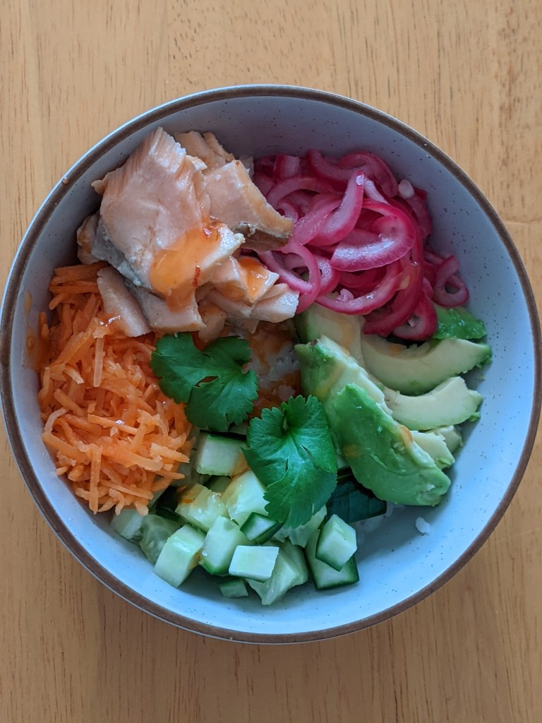 Once the rice is done place the rice at the bottom on the bottom of the bowl and then decorate with the rest of the ingredients.