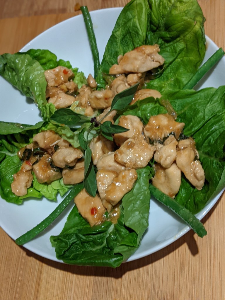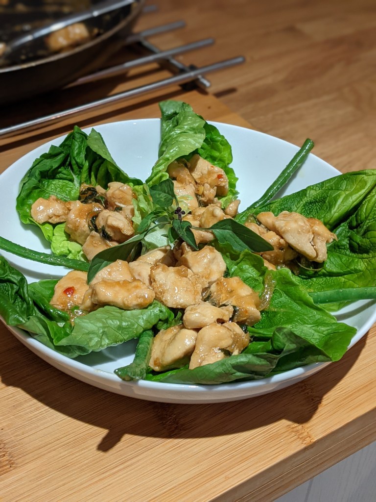 Once your sauce has thickened add the Thai holy basil and stir until covered.