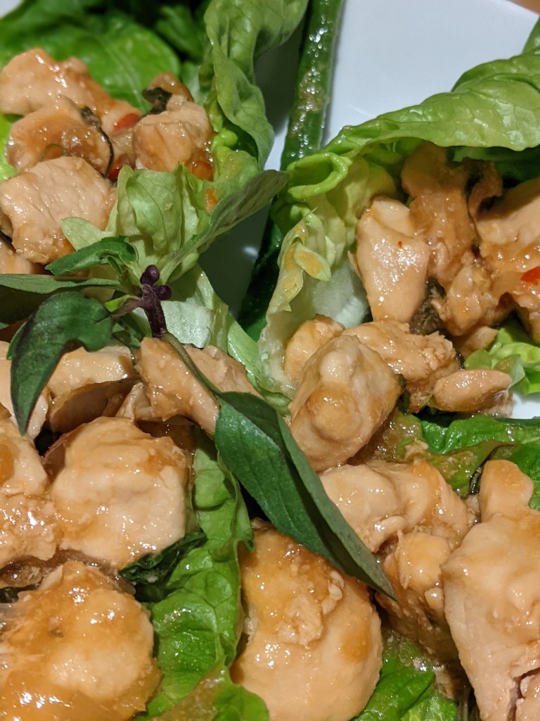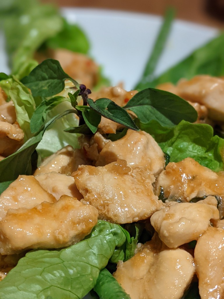 Once the chicken is cooked add the Shaoxing wine, tamari, mirin and sweet chili and cook until the sauce has thickened.