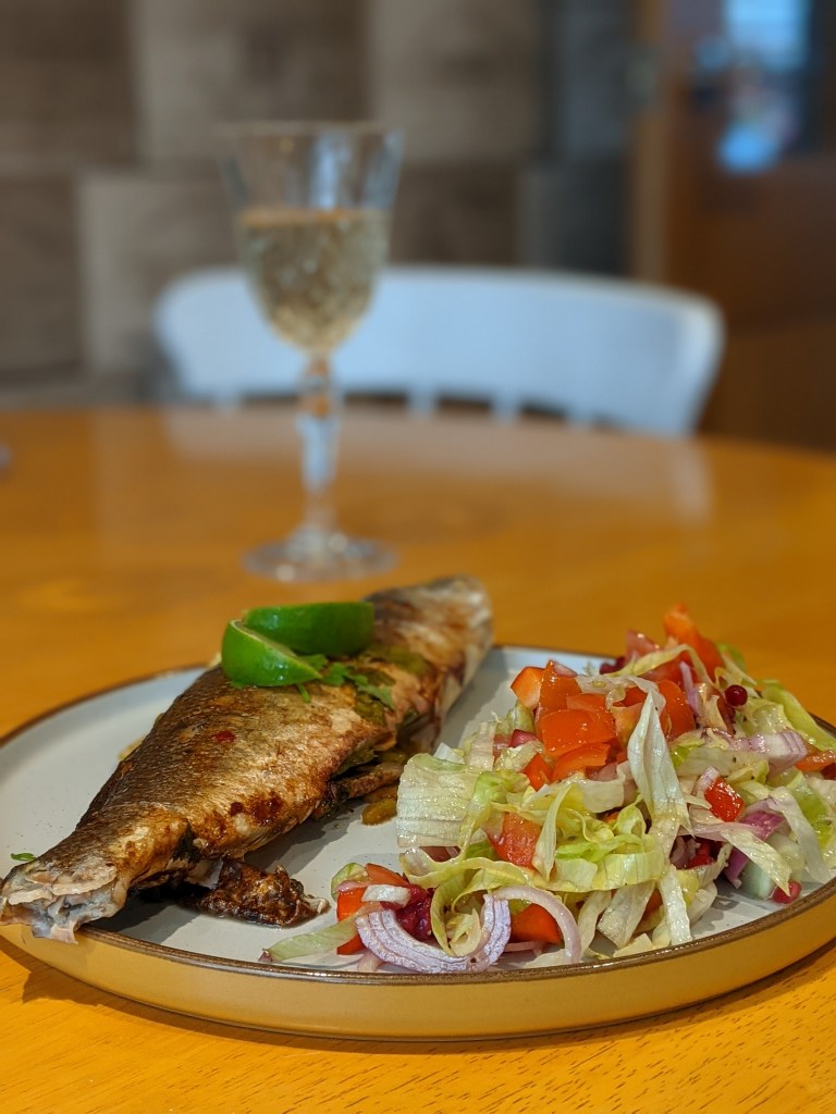 Once the skin is crispy plate the fish and have with a side of your choice, we had a pomegranate salad.
