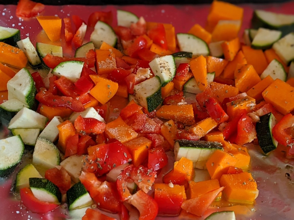 To begin with chop up the butternut squash, peppers and courgette and place on a baking tray drizzle with olive oil and place in the oven for 20 minutes at a heat of 180c