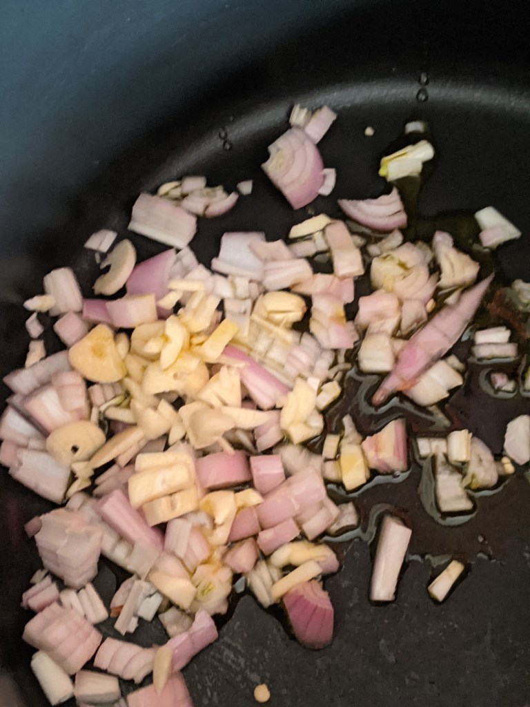 Whilst waiting for the vegetable to roast finely dice the shallot and garlic finely and cook until translucent ,then add the tinned cherry tomatoes. Once you have added the tomatoes. Add the tomato puree, vegetable stock cube, the sugar, dried thyme and oregano and leave to simmer.