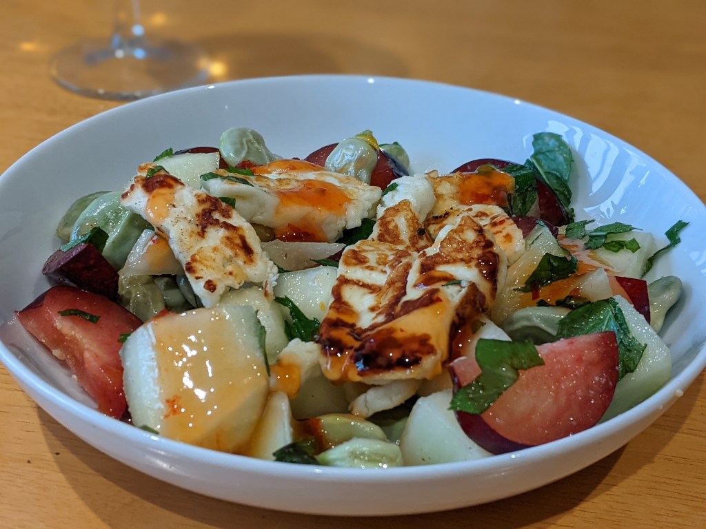 For this recipe our niece cooked as part of her Duke of Edinburgh award. This was a nice light meal with the sweetness of the peaches complimenting the halloumi and mozzarella.